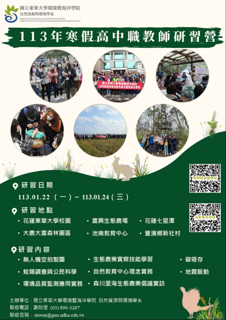 轉知國立東華大學舉辦113年寒假高中(職)教師研習營活動(1.22-1.24),報名時間延長至112年11月25日(六)止,詳情請參閱附件與連結。