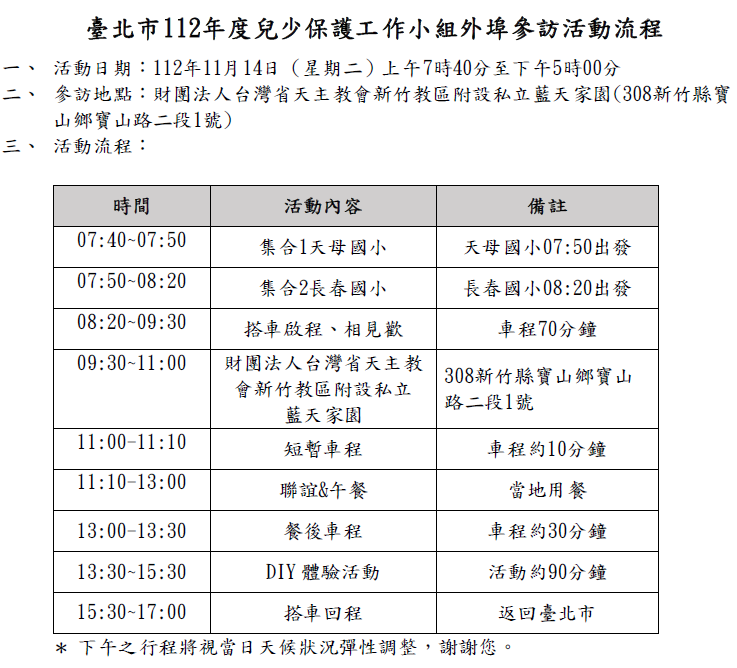 (三)地點:財團法人台灣省天主教會新竹教區附設私立藍天家園(308新竹縣寶山鄉寶山路二段1號)。