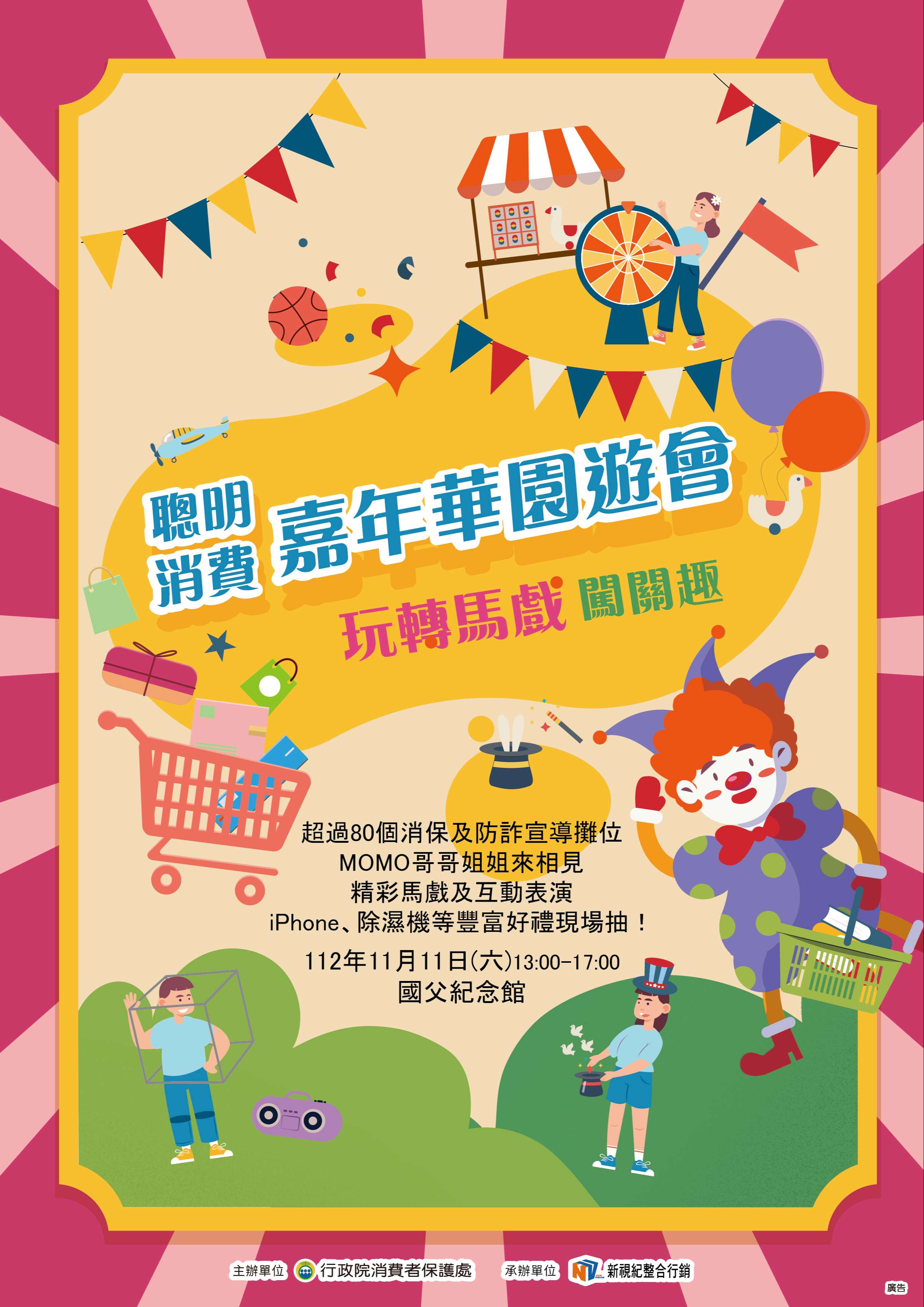 112年11月11日下午1時至5時,歡迎前往國父 紀念館參加聰明消費嘉年華園遊會,闖關抽大獎。