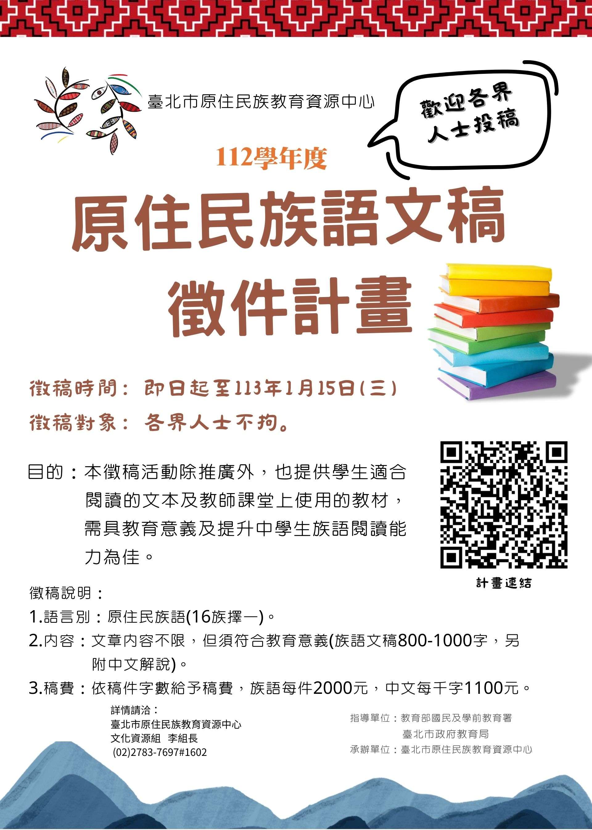 2、內容:文章內容不限,但須符合教育意義(族語文稿800-1000字,另附中文解說)。