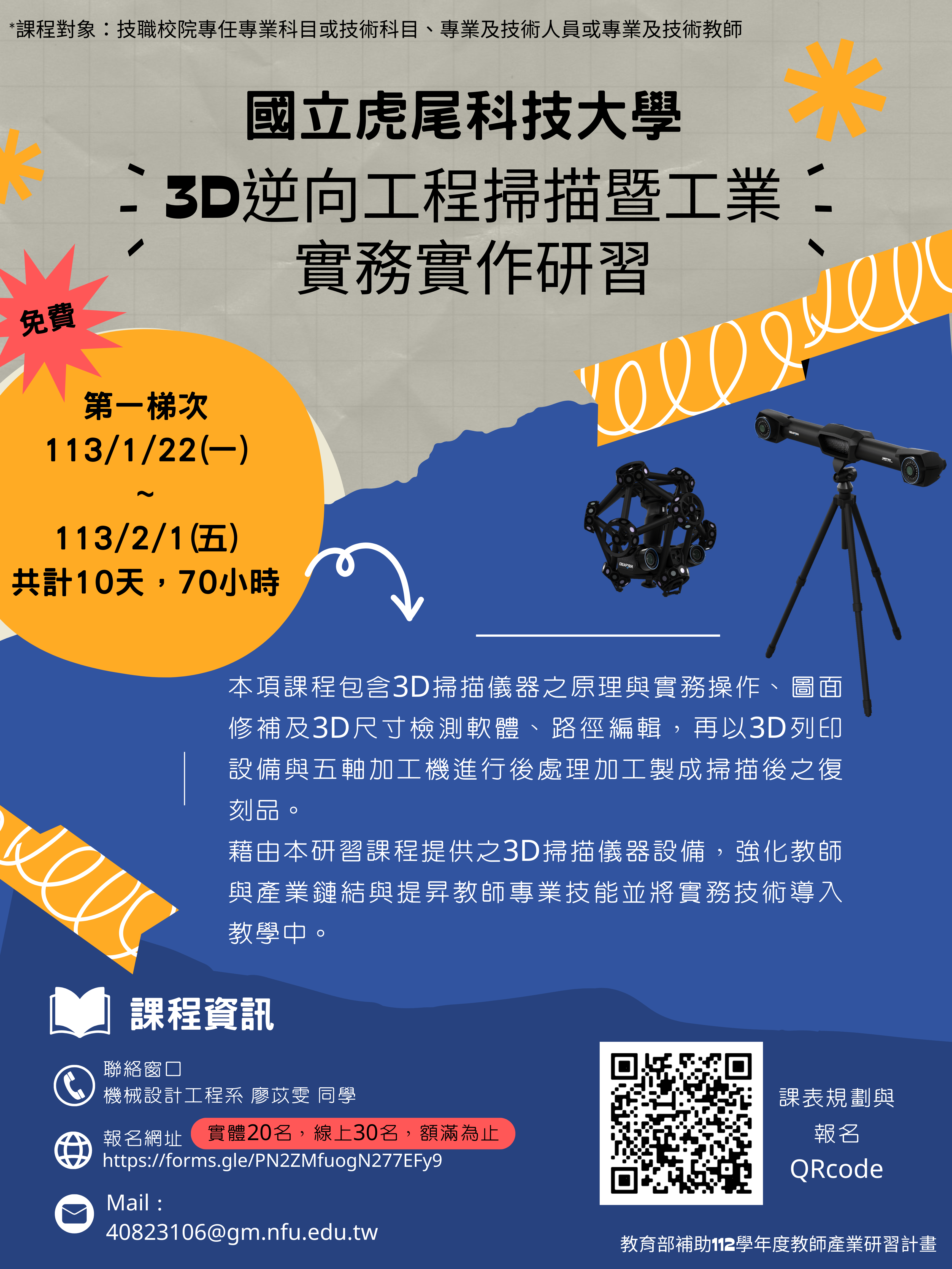 二、本項課程包含3D掃描儀器之原理與實務操作、圖面修補及3D尺寸檢測軟體、路徑編輯,再以3D列印設備與五軸加工機進行後處理加工製成掃描後之復刻品,藉由本研習課程提供之3D掃描儀器設備,強化教師與產業鏈結與提昇教師 專業技能並將實務技術導入教學中。