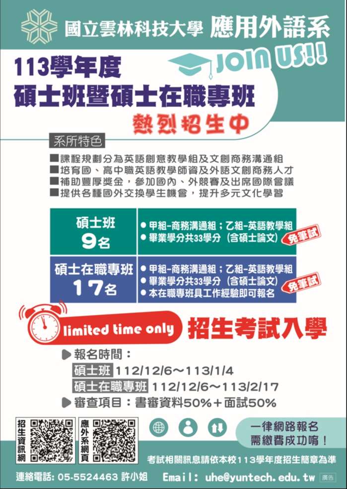 四、招生簡章詳情請至國立雲林科技大學應用外語系網頁下載:https://reurl.cc/E1qj9n