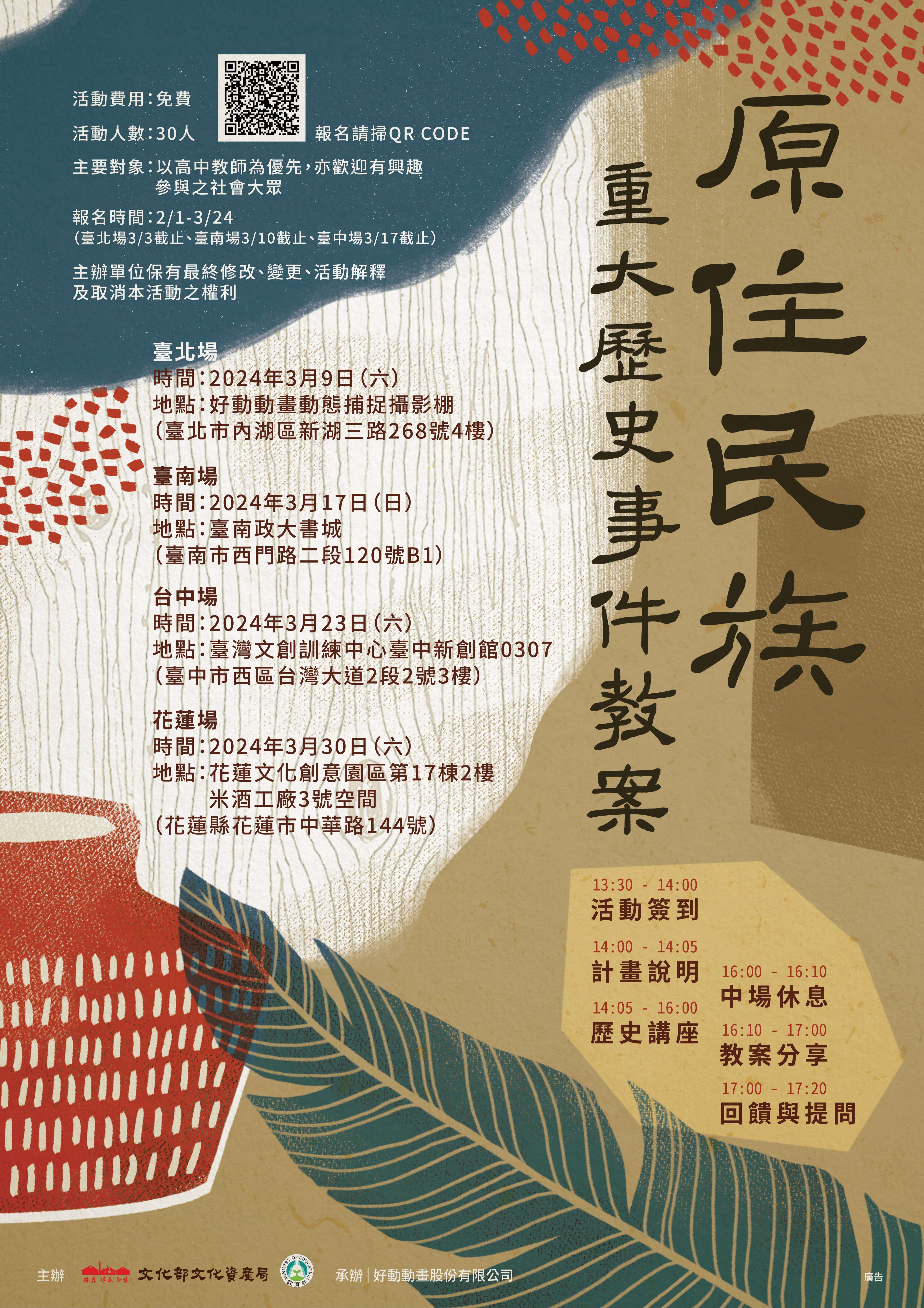 轉知文化部文化資產局委託好動動畫股份有限公司辦理 「原住民族重大歷史事件教案工作坊」報名資訊,詳情請參閱附件。