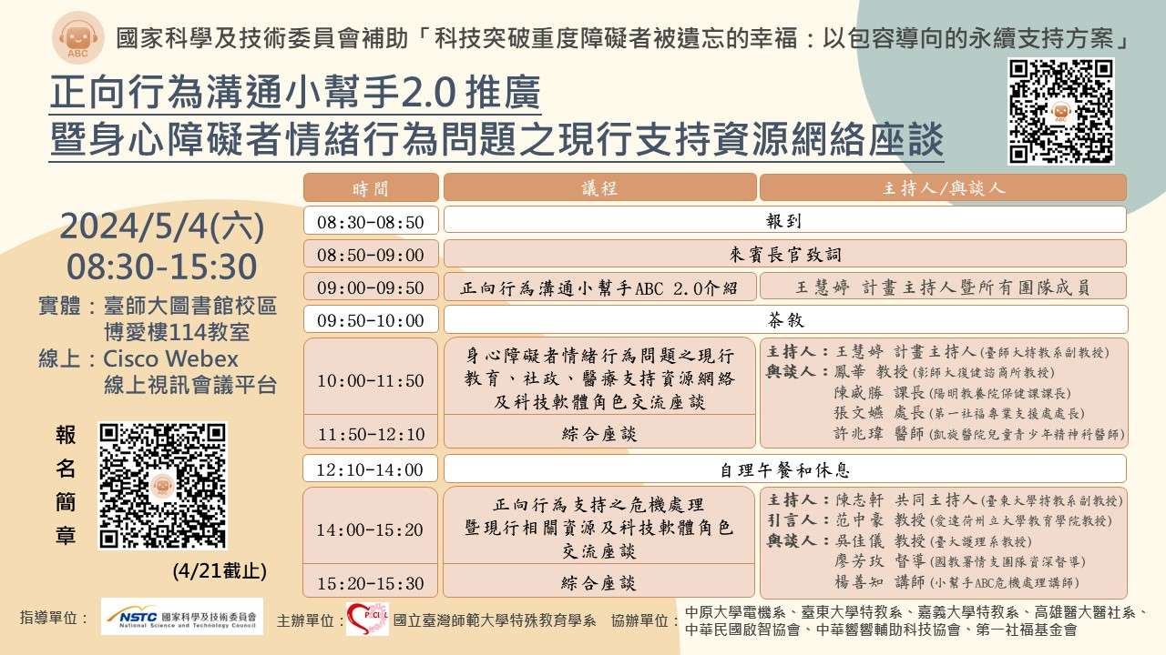 轉知國立臺灣師範大學特殊教育系王慧婷副教授舉辦之「正向行為溝通小幫手2.0推廣暨身心障礙者情緒行為問題之現行支持資源網絡」座談會一案,請有興趣教師自行報名線上課程,詳情請參閱附件。