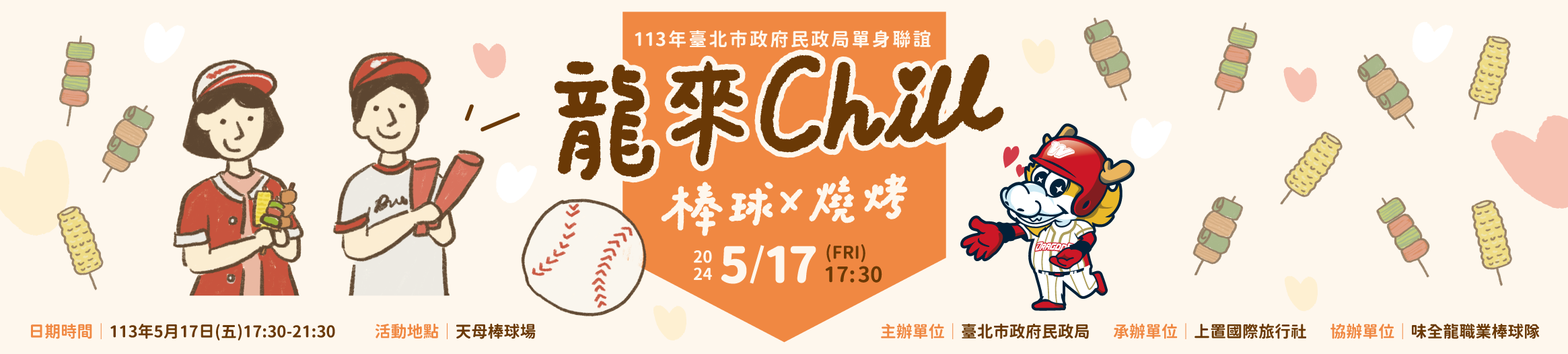 「龍來chill」棒球燒烤主題聯誼,訂於113年5月17日下午5點30分在天母棒球場辦理,