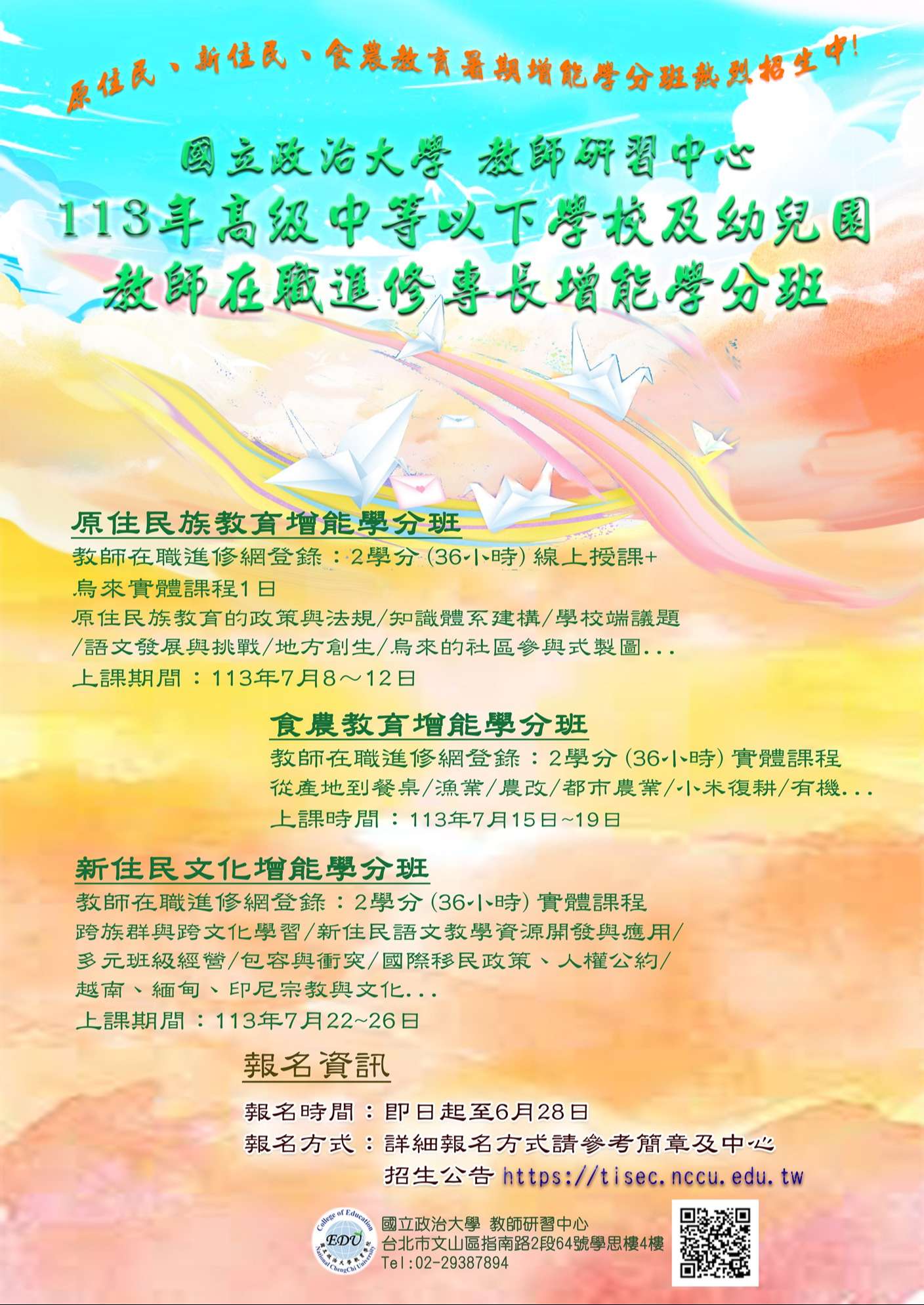 轉知國立政治大學教育學院教師研習中心執行教育部補助辦理「113年度高級中等以下學校教師在職進修專長增能學分班」簡章(如附件)尚有報名名額,歡迎教師踴躍報名,詳情請參閱附件。