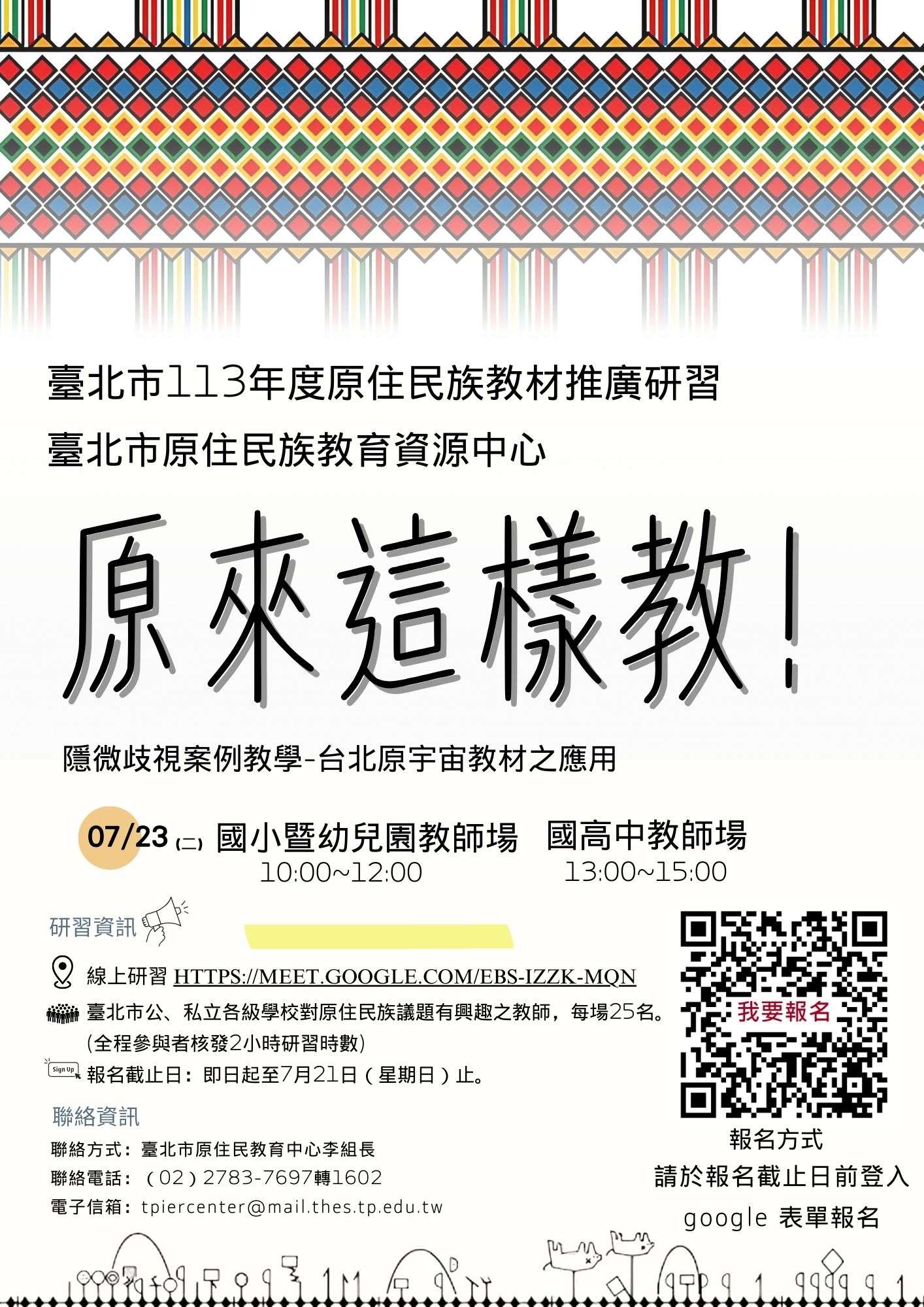 轉知本市原住民族教育資源中心「隱微歧視案例教學-原住民族教材推廣線上研習實施計畫」,請有興趣教師自行報名線上課程,詳情請參閱附件。