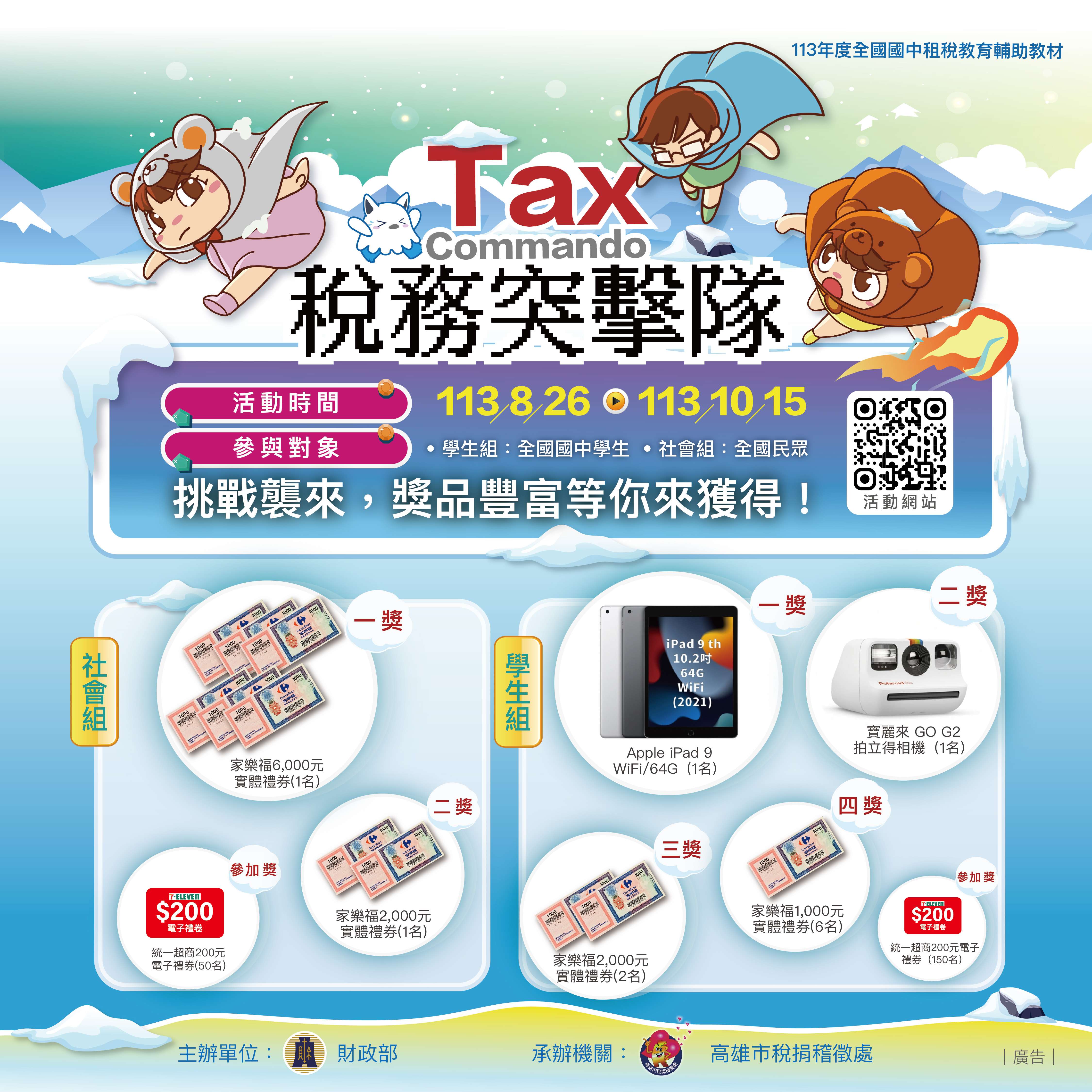 主旨:函轉高雄市稅捐稽徵處舉辦113年度全國國中租稅教材「稅務突擊隊」網路抽獎活動如說明,請協助宣導並轉知師生踴躍參與。