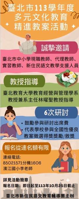 轉知臺北市新住民語文教育輔導團辦理113學年度「多元文化教育精進教案活動」,詳情請參閱附件與連結。