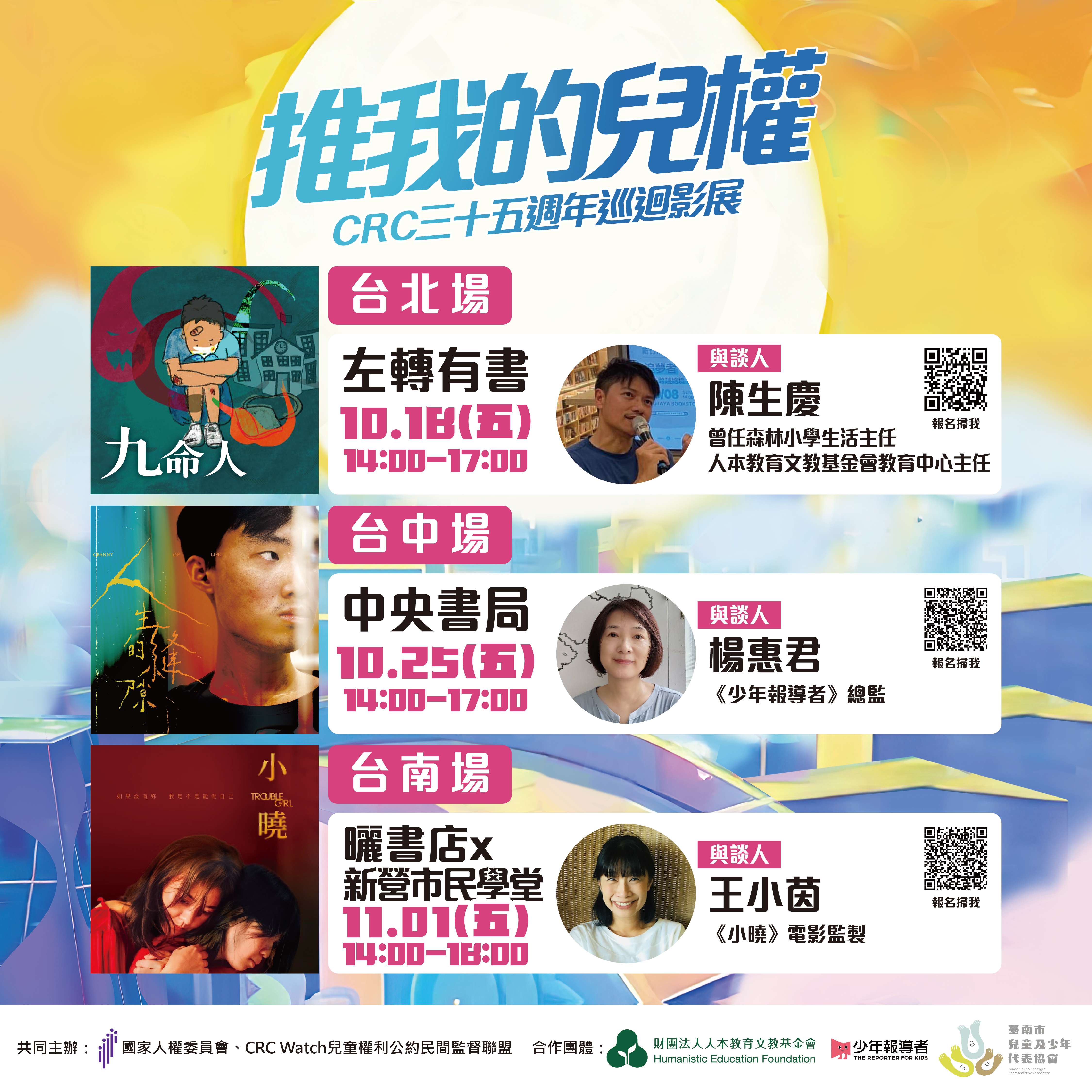 主旨:檢送社團法人台灣少年權益與福利促進聯盟辦理「【推我的兒權】CRC三十五週年巡迴影展」簡章、報名表QRCode(共3場次)及海報各1份,請鼓勵師生踴躍報名參與一案,請查照。