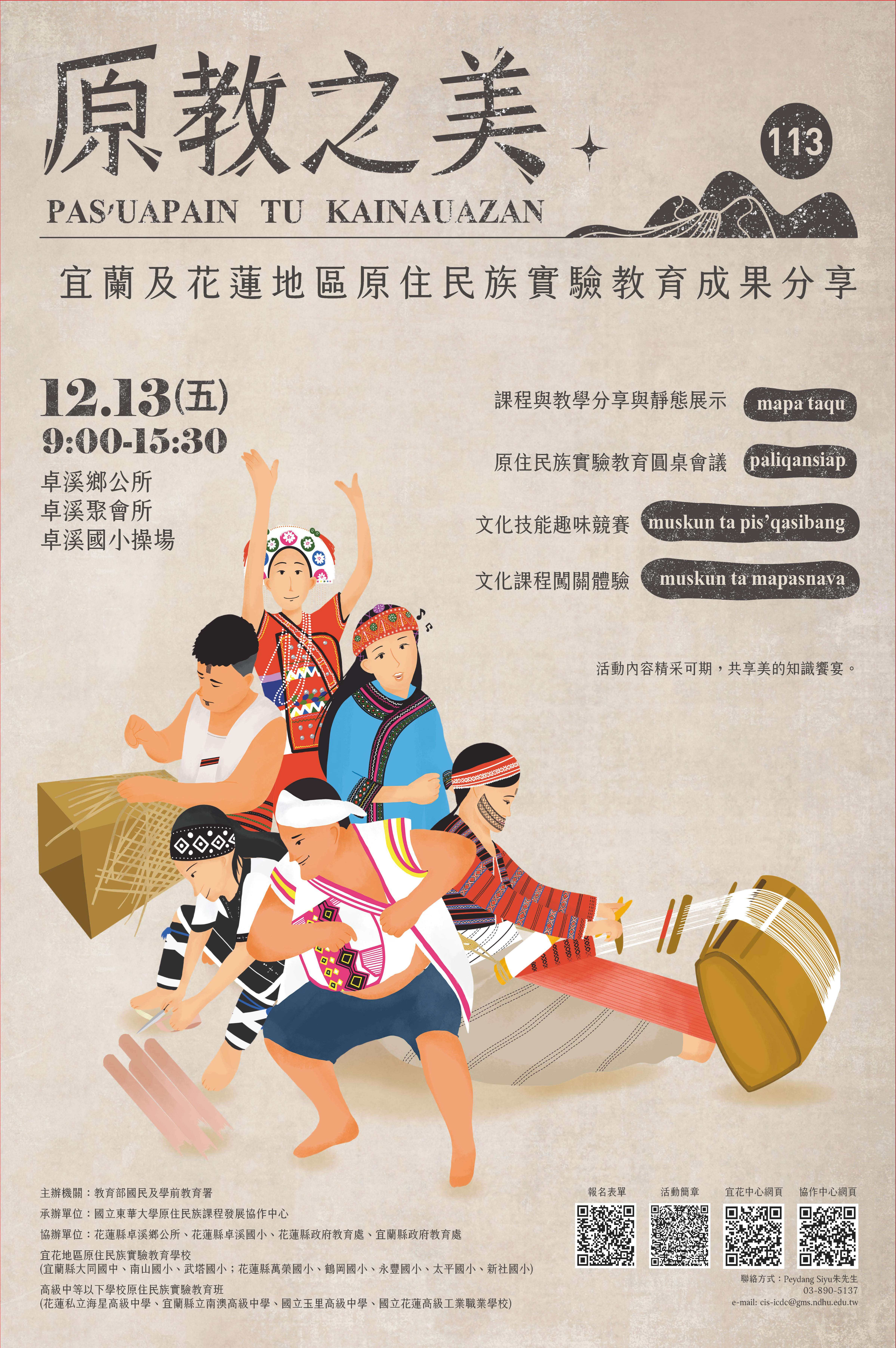 轉知國立東華大學原住民族課程發展協作中心辦理 「Pas'uapain tu kainauazan!原教之美─113年宜花地區原住民族實驗教育成果分享」實施計畫書及活動海報各1份,詳情請參閱附件。