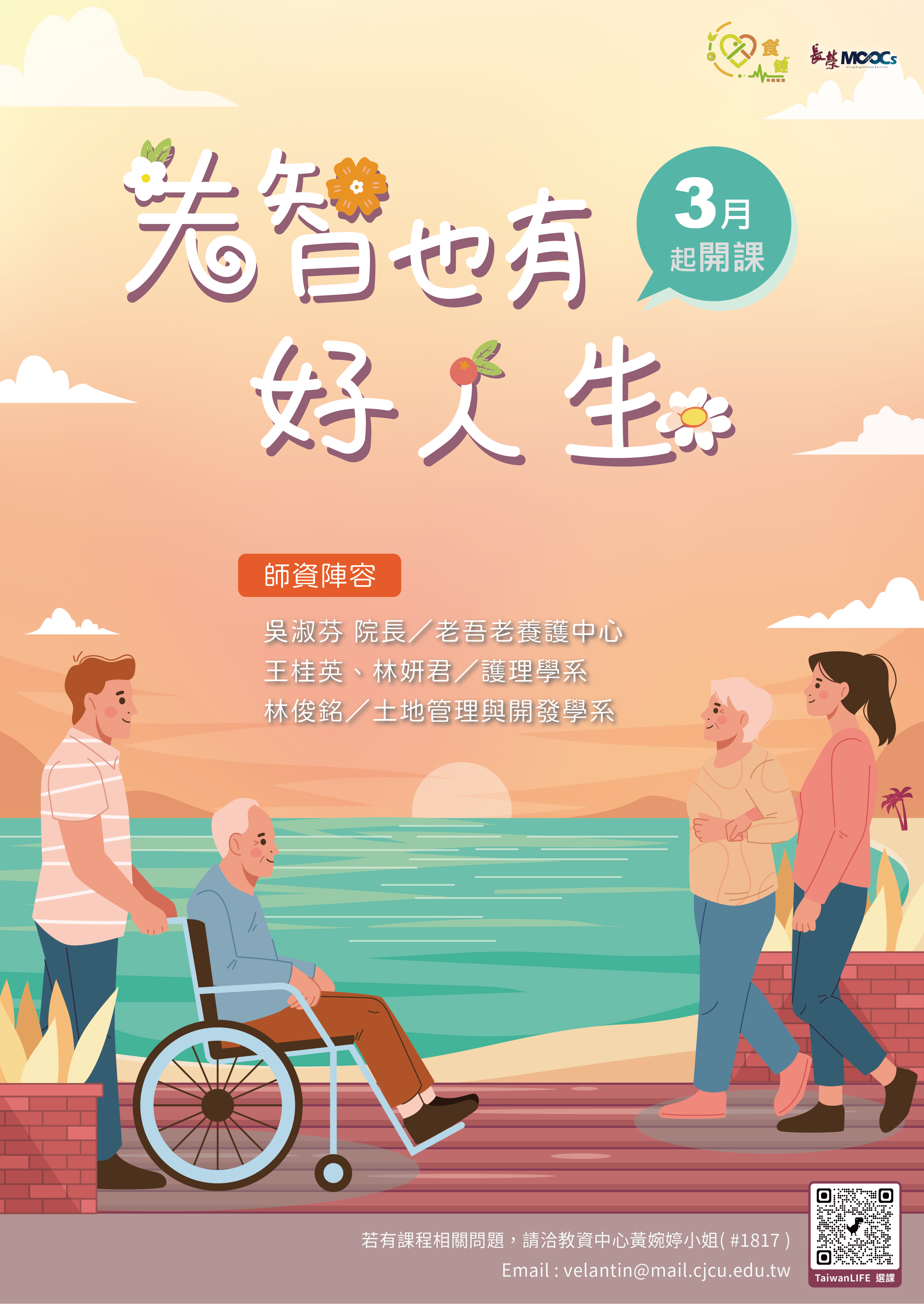 一、因應「大學聯盟深化數位學習推展與創新應用計畫-食健 幸福聯盟」所發展規劃的「長照復能,攜手前行」系列課 程。本課程「失智也有好人生」由老吾老養護中心吳淑芬 院長、護理學系王桂英及林妍君老師、土地管理與開發學 系林俊銘老師共同講授。
