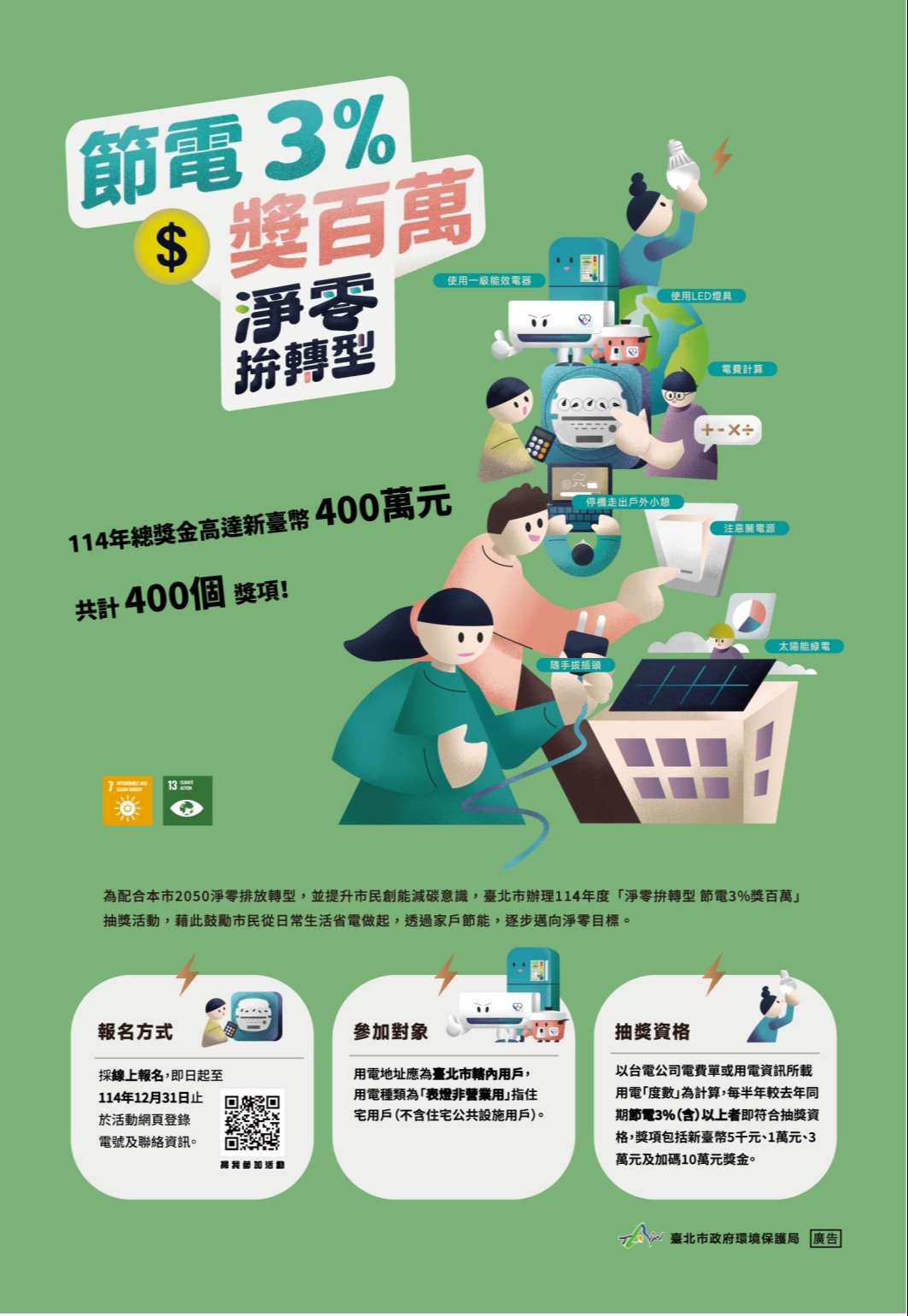 為鼓勵市民落實節能減碳行動,本局114年「淨零拚轉型節 電3%獎百萬」抽獎活動(網址:https://energysaving. gov.taipei/),即日起至114年12月31日辦理。