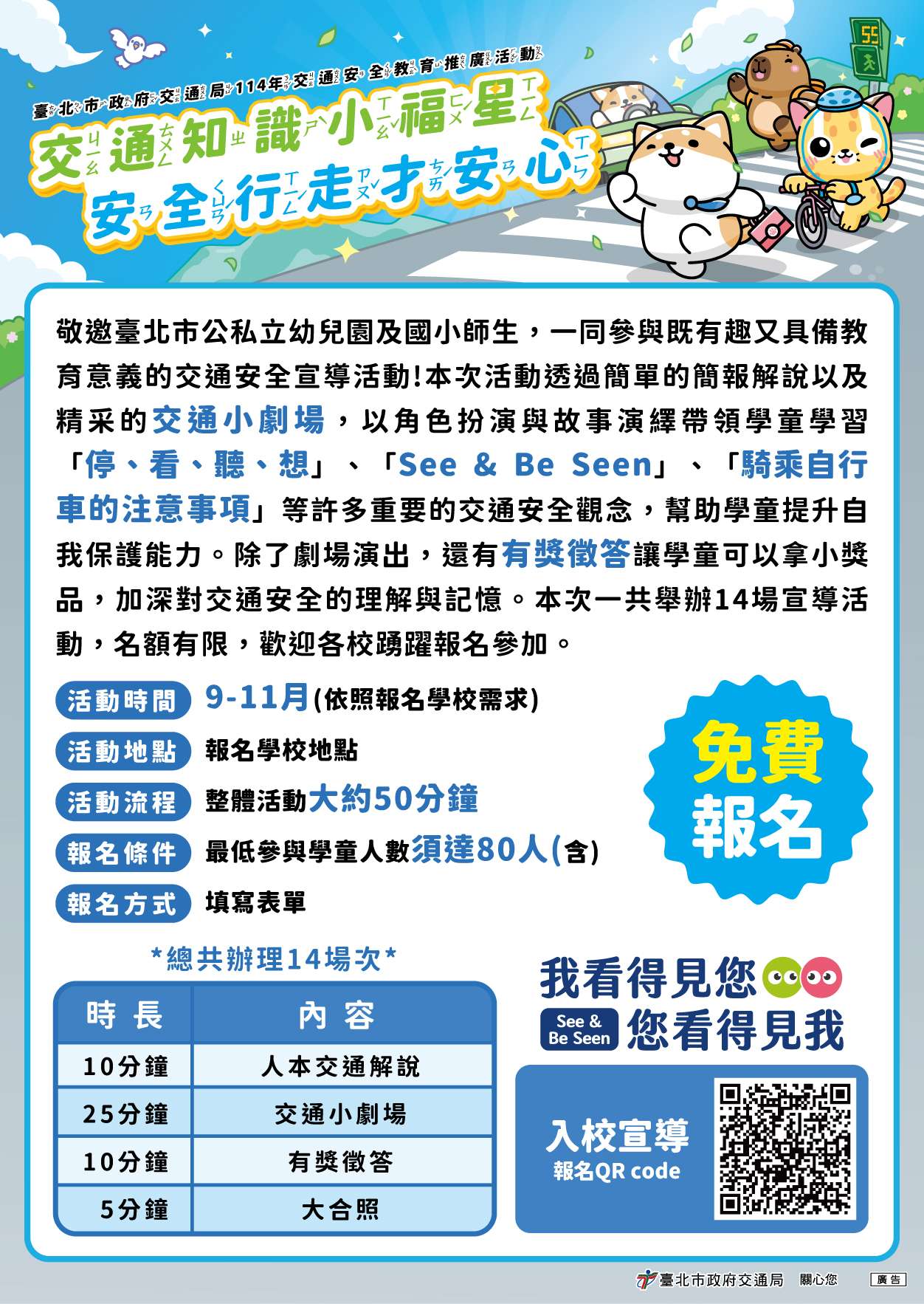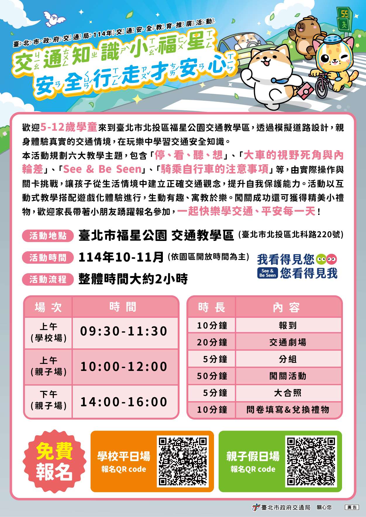 升自我保護能力,降低交通事故發生風險,本府交通局於今(114)年10月將新增啟用第二座交通公園交通教學區(實際啟用日期依交通局通知為主),位置於臺北市福星公園(臺北市北投區北科路220號)。該局委託雷科斯國際有限公司於該教學區辦理「114年交通安全教育推廣活動」,訂於114年9月至11月間舉行,內容如下: