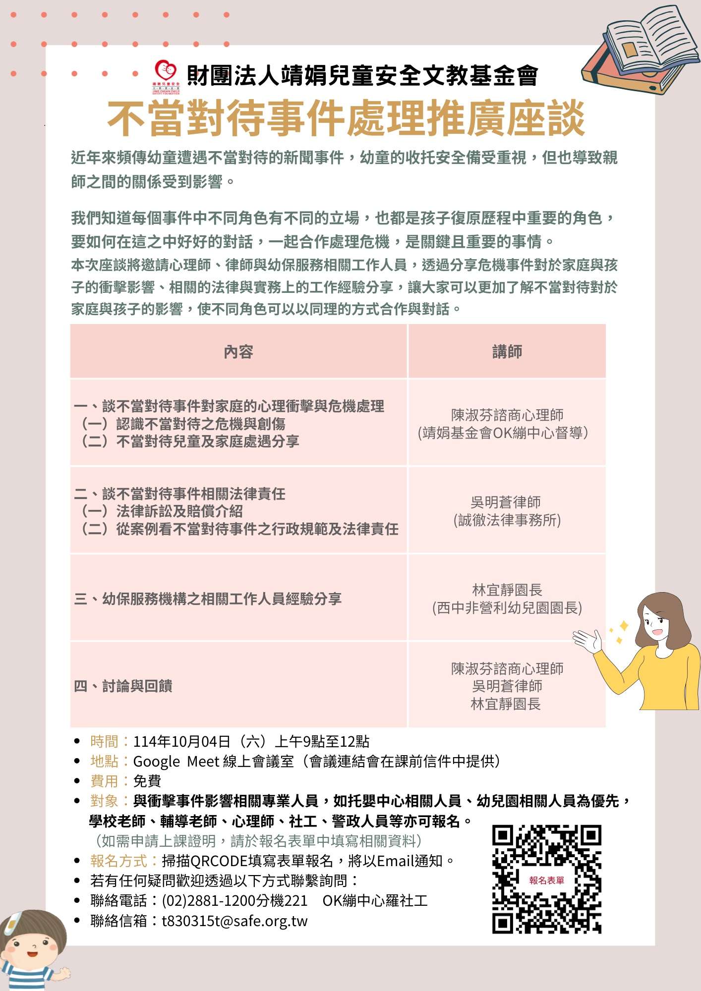 一、依據財團法人靖娟兒童安全文教基金會114年8月28日114靖娟北總字第1140000350號函辦理。二、檢附「不當對待事件處理推廣座談」單張1份。