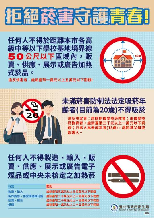 二、鑑於2家加熱菸業者產品即將合法上市,為避免青少年誤認 其無害或產生好奇而接觸,該局特製作宣導海報,提升本 市高中職以下學校學生菸害防制知能及瞭解菸害防制法相 關罰則。