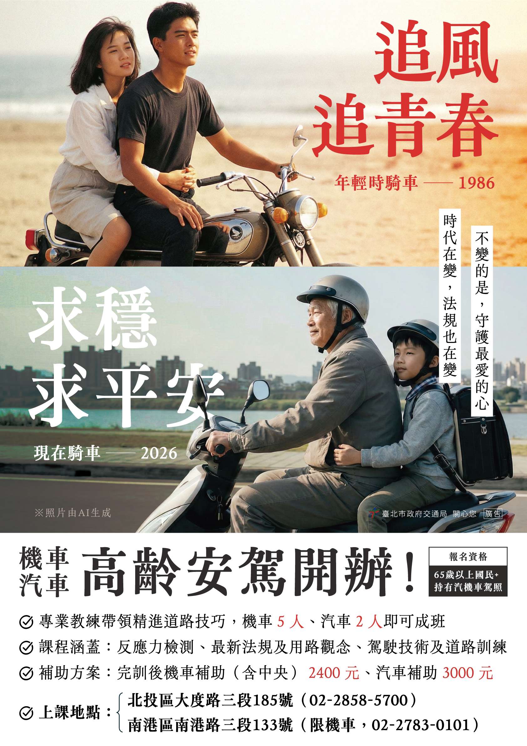 二、為提升高齡者交通安全意識及增進駕駛技能,臺北市政府交通局推動高齡汽機車駕訓補助措施,鼓勵高齡民眾參與道路駕駛訓練課程,以降低交通事故風險。
